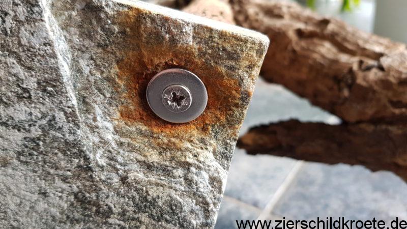 Die Steinplatte dient zur Fixierung der Astgabeln. Dazu werden zunächst zwei Löcker mit einem Steinbohrer in die Steinplatte gebohrt. Mit einer Unterlegscheibe und einer langen Edelstahl-Schraube werden die Astgabeln auf der Steinplatte fixiert.