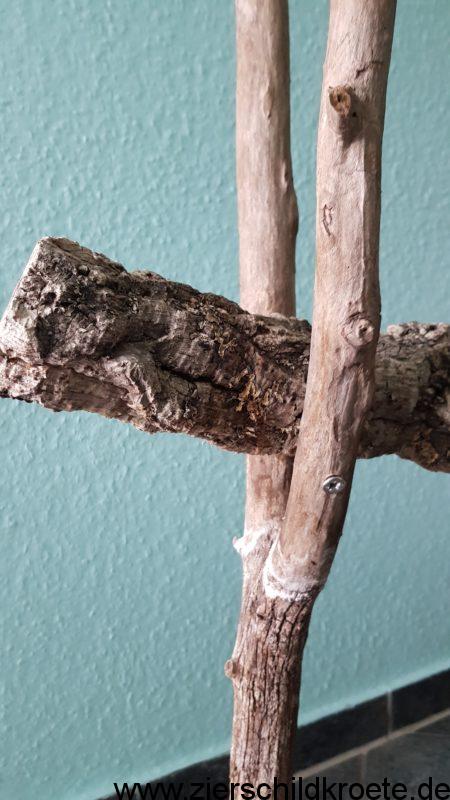 In die beiden Astgabeln wird ein weiteres Treibholzstück oder ein Korkast gelegt. Auch dieser Ast wird mit Schrauben fixiert.