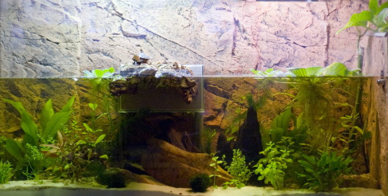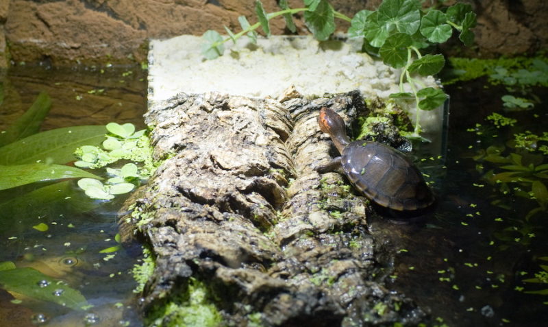 Der Landteil besteht aus einem mit Sand gefüllten Mini-Aquarium (20 x 15 x 15 cm), das auf Stelzen aus Plastikrohren steht, und aus einer Korkrinde, die zwischen Sand-Insel und Vorderwand geklemmt ist. Die Stelzenkonstrution würde ich allerdings nicht weiterempfehlen: Ohne die stabilisierende Korkrinde, wäre sie reichlich wackelig. Mit Glasstelzen würde es vielleicht besser funktionieren? Außerdem werden wir bei der nächsten Renovierung, die Sand-Insel mit den Resten der Back-To-Nature-Rückwand bekleben. Unsere Kinosternon kann nämlich Glas nicht leiden … (versucht sich vergeblich daran festzuhalten).