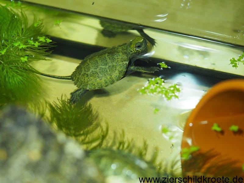 Kleine Wasserschildkröten sind stressanfälliger und können sich sogar von Fischen einschüchtern lassen. Daher sollten die Fische zum einen nicht zu zahlreich sein und zum anderen keinesfalls größer als die Schildkröten.