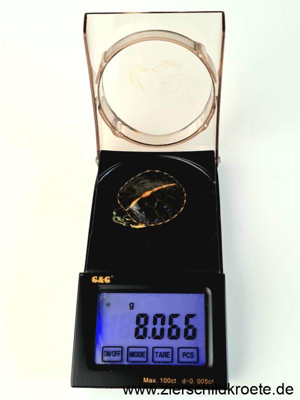 Das Gewicht wird mit einer Waage ermittelt. Bei kleinen Schlüpflingen sollte man dafür eine Feinwaage verwenden. Klar geht das auch mit einer Küchenwaage, aber die ist bei unter 50 g doch sehr ungenau. Auch bei einer Feinwaage würde ich nicht auf die dritte Stelle nach dem Komma gucken, sondern nur auf eine Stelle hinter dem Komma. Es sei denn man hat eine wirklich teure Waage aus dem Laborbedarf. Aber dann müsste man auch bedenken wie viel Feuchtigkeit auf dem Panzer ist. Wenn die Schildkröte mehr als 50 g wiegt kann man auf eine andere Waage wechseln. Aber aufgrund der Möglichkeit, dass Schildkröten Salmonellen übertragen können sollte man nicht die Küchenwaage verwenden, sondern eine eigene Waage für die Wasserschildkröte anschaffen.