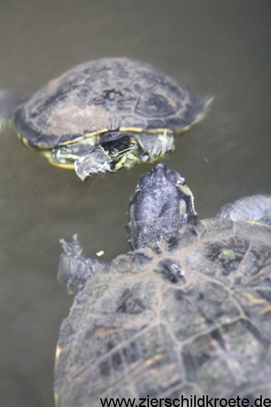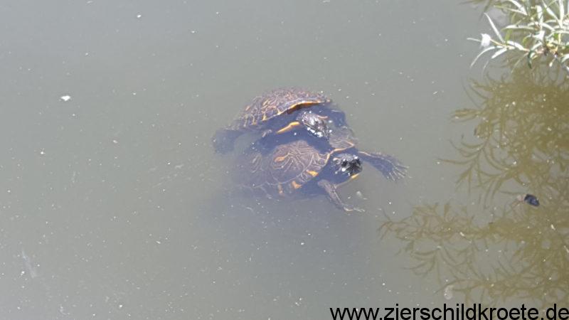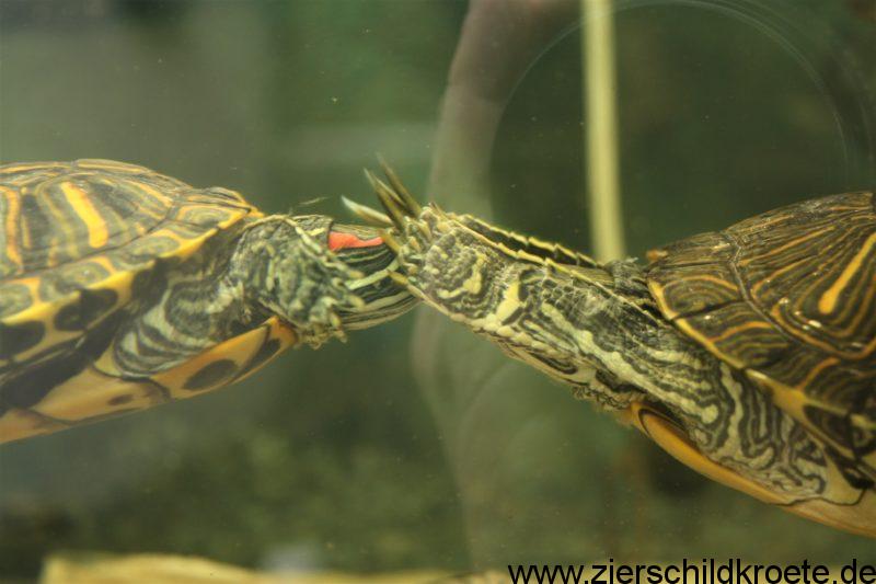 Die Balz von Zierschildkröten (Chrysemys picta) und Buchstaben-Schmuckschildkröten (Trachemys scripta) läuft ganz ähnlich ab, auf den Bildern sieht man ein Pärchen Zierschildkröten welches im Teich balzt. Dazu schwimmt das männliche Tier frontal auf das Weibchen zu und zittert mit seinen verlängerten Krallen am Kopf des Weibchens.