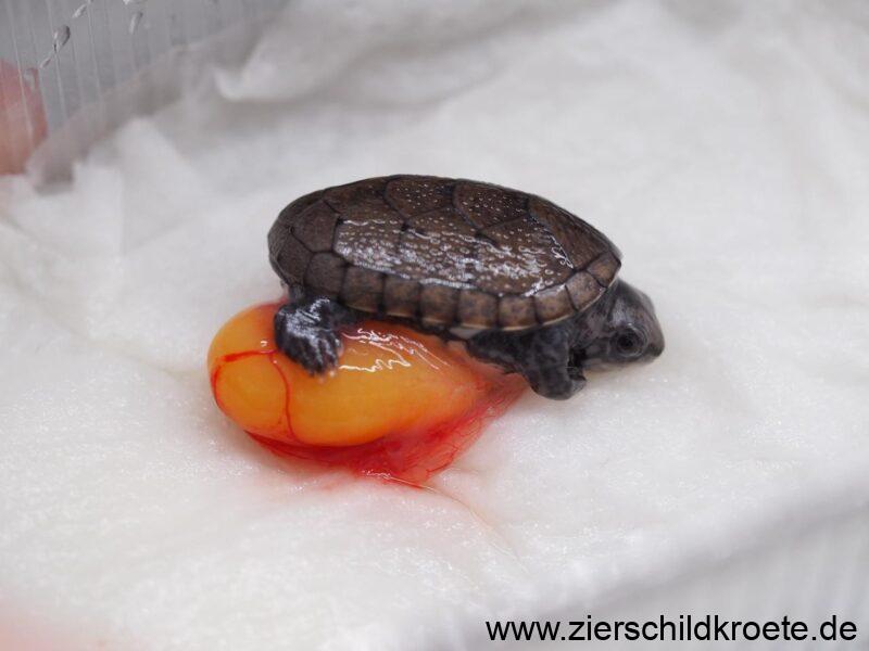 Normalerweise sollten Schildkröten erst dann schlüpfen, wenn der Dottersack fast resorbiert ist. Sie buddeln sich dann aber nicht unbedingt sofort an die Oberfläche. Im Inkubator ist die Substratschicht über den Eiern in der Regel geringer als in der Natur, daher sitzen die Wasserschildkröten-Babys schneller „oben“ als es in der Natur der Fall wäre. Daher empfehle ich immer die Eier zu 100 % zu vergraben und nicht etwas aus dem Brutsubstrat herausschauen zu lassen. Das verhindert schon oft zu frühes Schlüpfen.