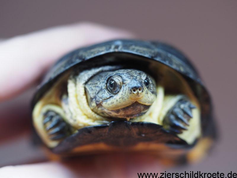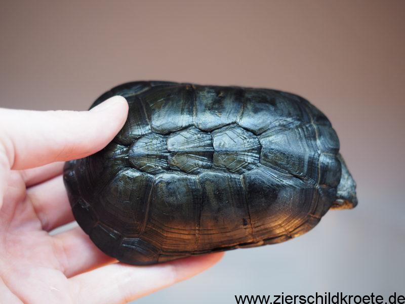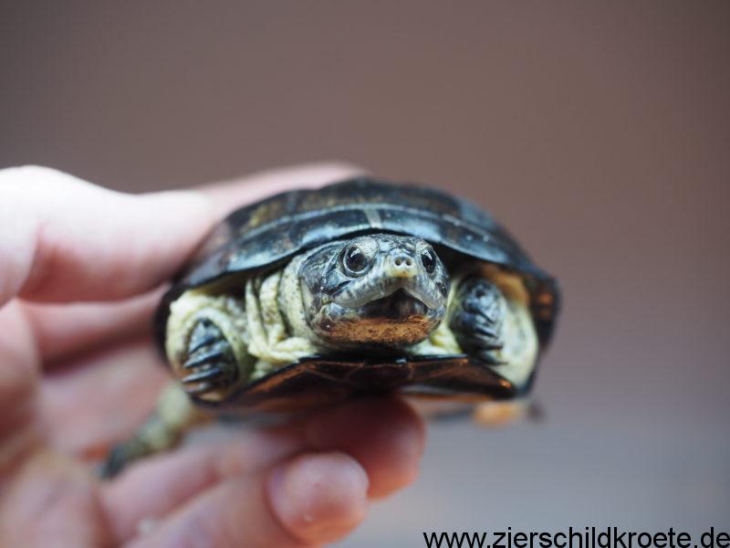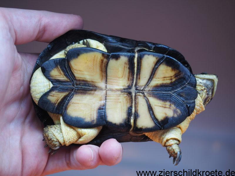 Ein paar Wochen nachdem man beide Geschlechter zur Paarung zusammengesetzt hat findet die Eiablage statt. Je nach Haltungssystem kann das sowohl im Frühjahr, als auch im Spätsommer/Herbst (nach der Trockenruhe) sein. Die Weibchen vergraben sich dazu fast vollständig unter der Oberfläche, ihr vorderes Ende zeigt dabei nach oben. Der Eiablageplatz sollte also tiefer mit Sand gefüllt sein als die weibliche Schildkröte lang ist. Ein Gelege besteht gewöhnlich aus vier bis sechs Eiern.